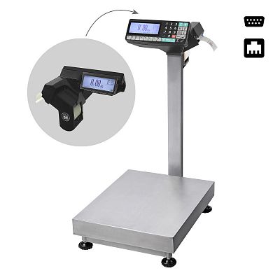 Напольные товарные весы с печатью этикеток с двухсторонней индикацией. Датчик, платформа, рама, стойка и элементы крепления модуля взвешивающего выполнены из нержавеющей стали. Весы предназначены для маркировки и учета весовых, штучных и счетных товаров. Память на 20 000 товаров. Весы печатают как простые этикетки с автоматически настраиваемым форматом, так и этикетки любой сложности. Поддерживают печать 10 форматов штрихкодов (EAN13…EAN128, GS1 DataBar Expanded Stacked, DataMatrix), регистрируют товароучетные операции (продажа, прием, отпуск, списание, инвентаризация). Легко интегрируются в системы учета, в том числе в режиме весового терминала сбора данных. 1С совместимы. Обеспечена возможность подключения к весам сканера штрихкодов и выносного промышленного индикатора. Обмен информацией с внешними устройствами реализован по интерфейсам Ethernet и RS-232, а также с помощью USB-flash накопителя. Библиотека драйверов и прикладных программ предоставляется бесплатно.