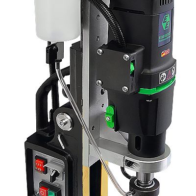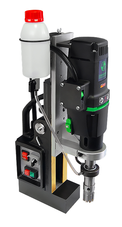 Сверлильный станок MBR-100 предназначен для промышленного использования. Эта модель выпускается с 2009 года и на протяжении всех последующих лет является одним из лучших в модельном ряду компании. Современное поколение этих магнитных сверлильных станков, производящихся компанией "Хайтек инструмент" в Московской области, обладает усовершенствованными характеристиками: мощный немецкий электродвигатель с двухкамерной системой смазки редуктора и механическим переключением двух скоростей; плавный старт, электронная бесступенчатая регулировка скорости вращения, шпиндель с конусом Морзе 3 для стандартных сверл; высокая точность изготовления - максимальное радиальное биение в пределах 0,08 мм; в комплекте держатель корончатых сверл с хвостовиком Weldon. Переключение направления вращения вала электропривода позволяет нарезать резьбу обычным метчиком. Наличие электронного ограничителя вращающего момента, даже без специального резьбонарезного патрона предохраняет метчик от поломки в глухом отверстии. Новый электромагнит, с увеличенной прижимной силой и специальной водостойкой пропиткой катушек.