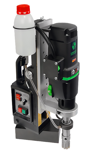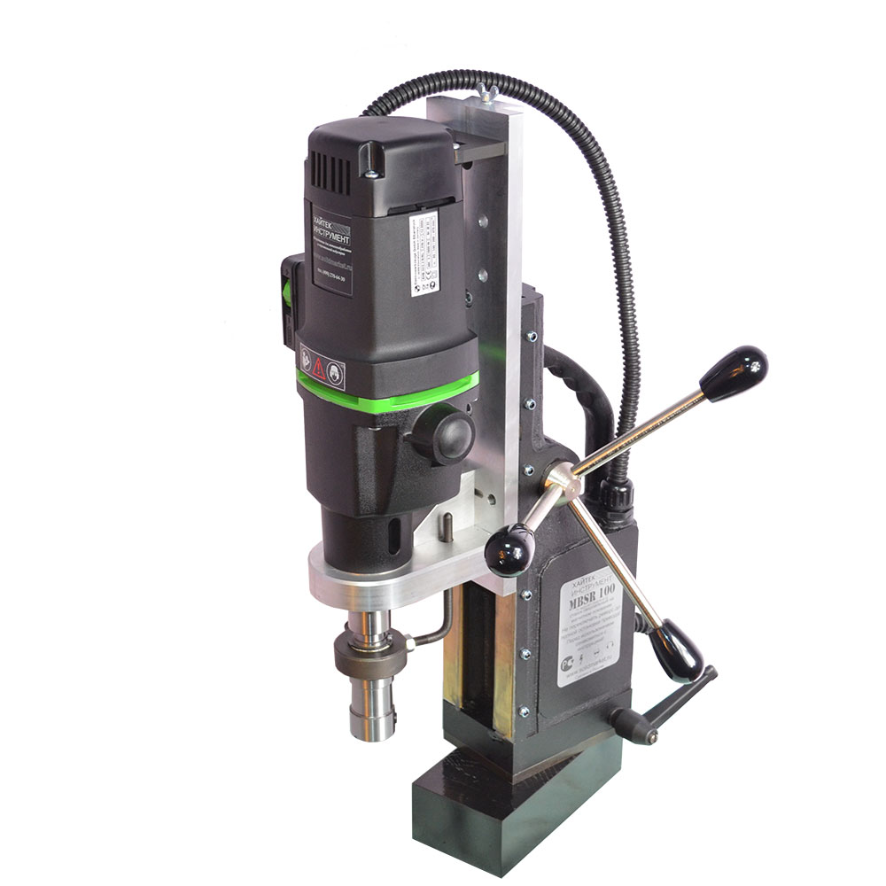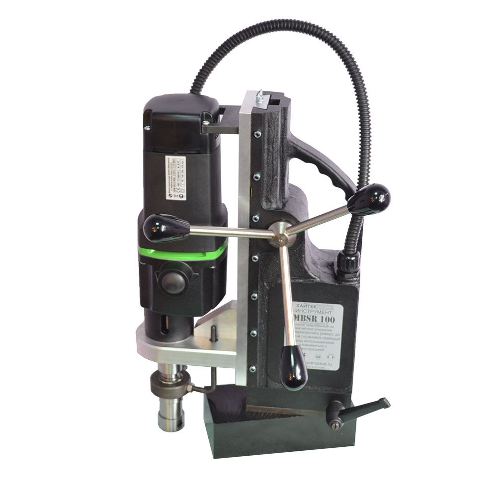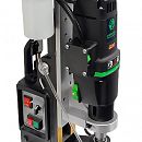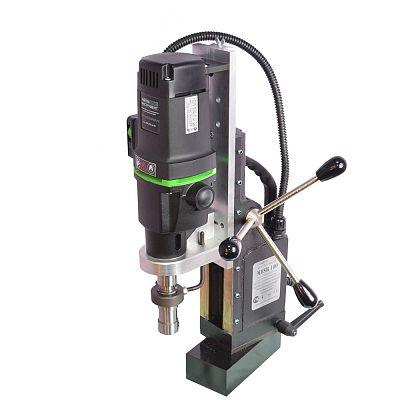 Предназначен для промышленного использования, сверления большого количества отверстий диаметром до 100 мм., также будет надежен при использовании спиральных сверл диаметром до 32 мм. Нарезка глухой резьбы возможна без специальных резьбонарезных патронов. Подвижное основание относительно магнита. Это станок с подвижным магнитным основанием, то есть при активированном электромагните возможно разъединить жесткую связь станины с магнитом и отрегулировать положение центра сверла, потом снова жестко закрепить станок поворотом рукоятки. Эта функция весьма полезна при сверлении вертикальных поверхностей, потому что трудно с первой попытки попасть довольно тяжелым магнитым станком в центр будущего отверстия. На магнитных станках зарубежных производителей такая функция называется "магнитное основание с юстировкой".