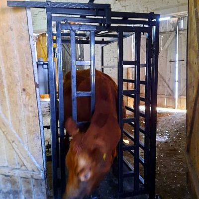 Станок надежно фиксирует животное в трех зонах (зона шеи, по бокам вдоль спины и в области задних ног) и обеспечивает для персонала безопасный доступ к любой части тела животного.